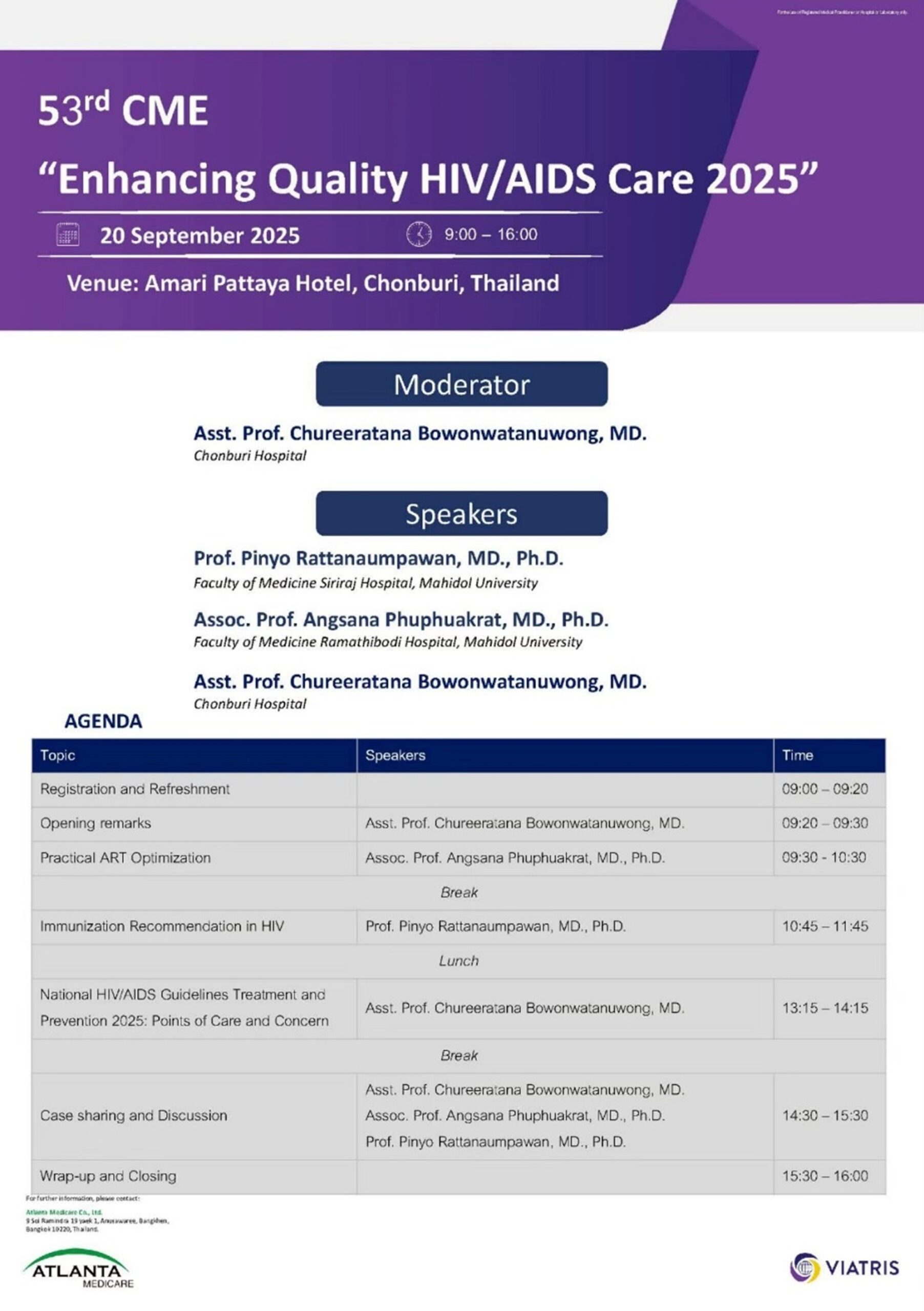 งานประชุมวิชาการ CME ครั้งที่ 53 จัดโดยบริษัท แอตแลนต้า เมดดิคแคร์ จำกัด ณ โรงแรม Amari Pattaya Hotel จังหวัดชลบุรี ในวันที่ 20 กันยายน 2568 ในหัวข้อ Enhacing quality HIV/AIDs care 2025 โดยได้รับเกียรติผู้เชี่ยวชาญด้านการดูแลรักษาผู้ติดเชื้อ HIV/AIDS มาร่วมถ่ายทอดองค์ความรู้และแนวทางปฏิบัติ เพื่อยกระดับคุณภาพชีวิตผู้ป่วยให้ดียิ่งขึ้น และบริษัทมุ่งมั่นที่จะสนับสนุนวิชาการและการพัฒนาสังคมด้านสุขภาพอย่างต่อเนื่อง
